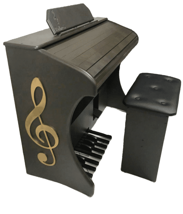 Design diferenciado, com luz neon que ilumina as teclas e a pedaleira, clave de sol na lateral e seu nome gravado na madeira